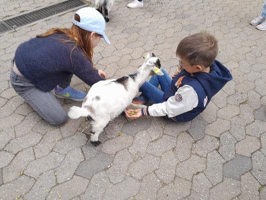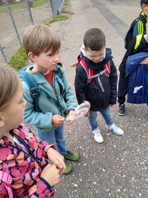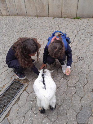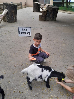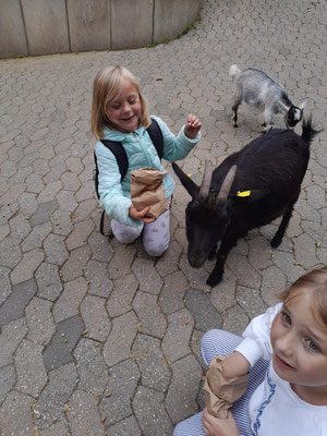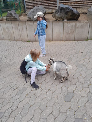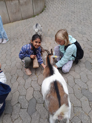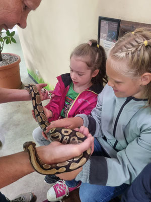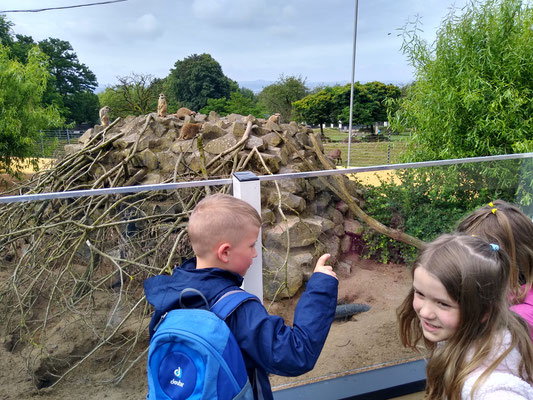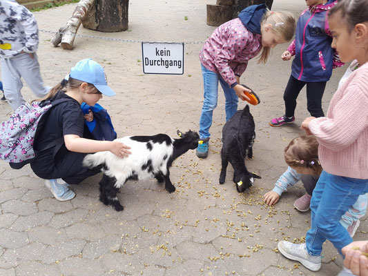 „Wir fahren in den Zoo! Wir fahren in den Zoo!“ – so schallte es schon die ganze Woche durch die Klassenzimmer der 1. Jahrgangsstufe. Am Mittwoch, den 03.07.2024, machten sich dann auch die Klassen 1 a, b, c und d auf in den Zoo Neuwied. Ausgerüstet mit Frühstück, Getränken und einer Regenjacke für den Notfall versammelten sich die Klassen am Eingang und überlegten schon gespannt welche Tiere sie heute alles entdecken könnten: Löwen, Affen, vielleicht sogar waschechte Krokodile? Die Vorfreude war enorm! Kaum durch den Eingang gegangen, wurden auch schon als Erstes die Flamingos entdeckt und mit großen Augen bestaunt. Und mit diesem Staunen ging es dann auch in die Zooschule, wo die Kinder von den freundlichen Mitarbeitern und Mitarbeiterinnen auf eine Spurensuche geschickt wurden. Wie groß ist eigentlich so ein Straußenei und wie groß wäre wohl ein Omelett daraus? Wie spitz ist ein Zahn von einem Krokodil? Und vor allem: wie fühlt sich eigentlich eine Schlange an? Mit angehaltenem Atem durften die Kinder die Antwort dann hautnah erfahren. Unter der wachsamen Aufsicht der Zoomitarbeitenden durften sie die Schlange einmal ganz vorsichtig anfassen. Große glitzernde Augen und offene Münder sah man in den Kindergesichtern und so manch einer war ganz verblüfft, dass so eine Schlange ja gar nicht schleimig ist, sondern rau und manchmal auch ganz weich. Stolz auf sich selbst besuchten sie dann die anderen Gehege des Zoos, denn immer noch gab es so viel zu sehen und zu entdecken! Es wurde gebannt zugehört wie laut der Löwe brüllen kann und mit dem Gepard wurde leise auf Katzenpfoten um die Wette geschlichen. Wie riesig doch ein Tiger sein kann und wie schnell Pinguine schwimmen können! Der Tag hätte doch bitte niemals enden können! Zum Schluss ging es auf den großen Spielplatz und dem angrenzenden Gehege der Ziegen. Wie schön doch so ein Ziegenauge aussieht, wenn man sich einmal die Zeit nimmt, um ganz genau hinzuschauen. Und wie beruhigend es doch sein kann, wenn man einfach mal ganz still für sich das Fell der Ziege bürstet!