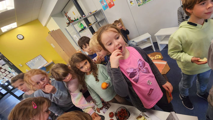 Der Klassenraum war liebevoll mit Herbstdekorationen geschmückt und die Tische waren reich gedeckt mit Obst, Gemüse und selbstgebackenen Leckereien, die die Kinder mitgebracht hatten. Jeder Schüler hatte die Gelegenheit, etwas über sein mitgebrachtes Lebensmittel zu erzählen und zu erklären, warum es wichtig ist, dankbar zu sein.